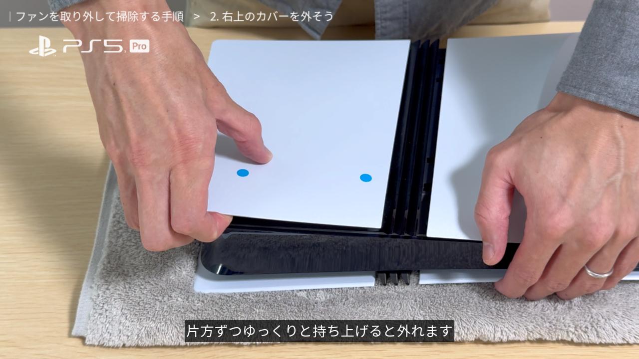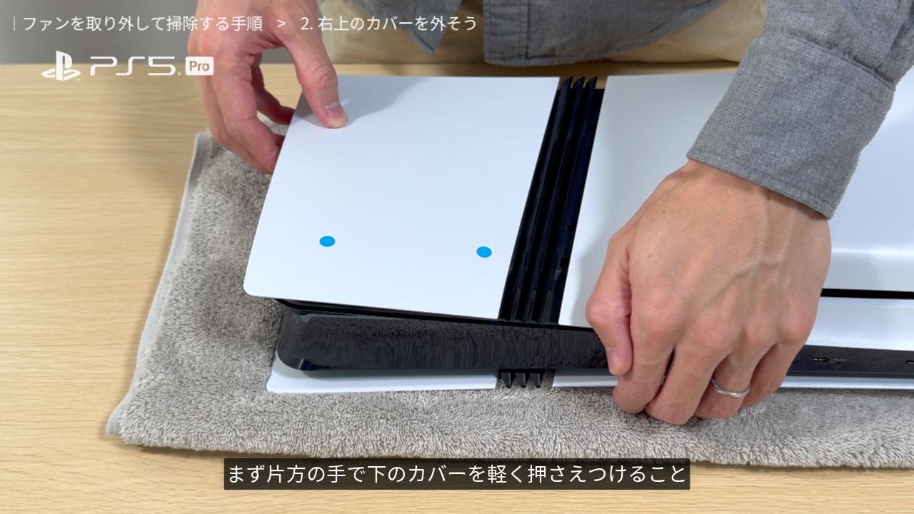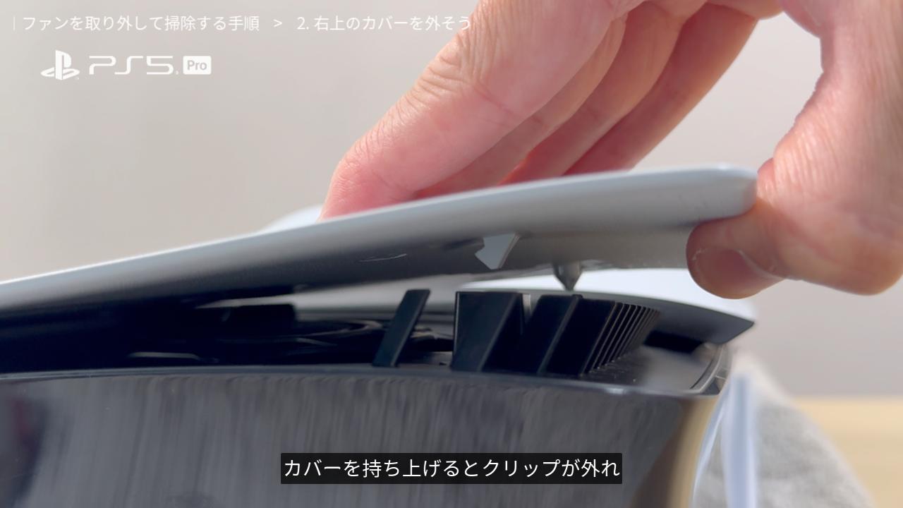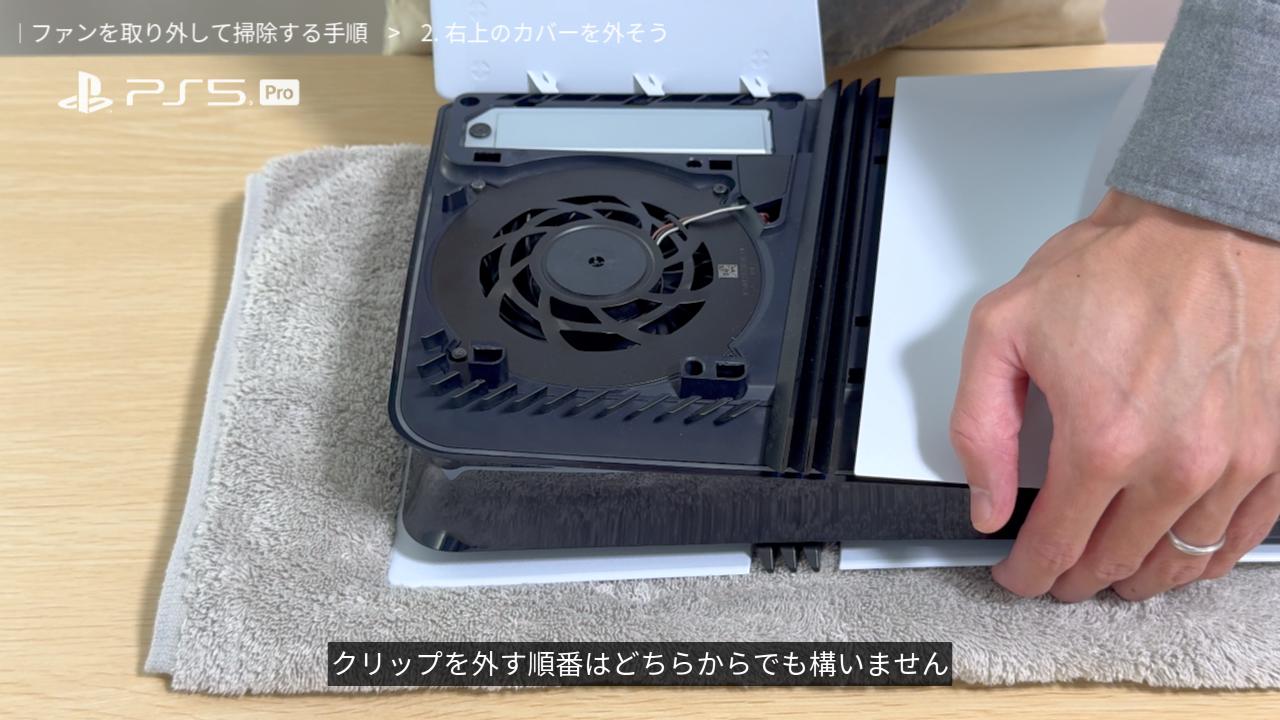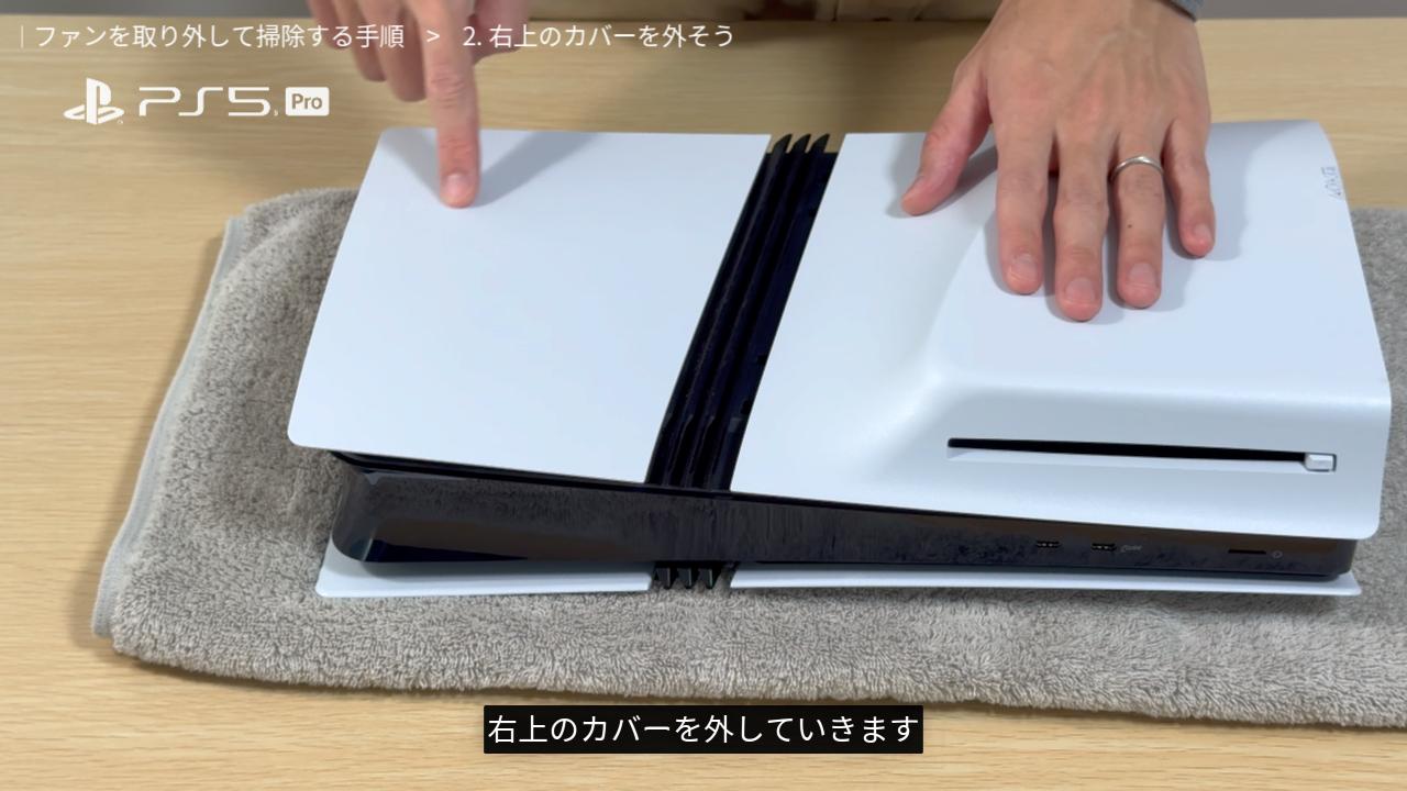 PS5 / PS5 Pro ともに、ファンは正面から見て右上のカバーを外すと現れます。右上のカバーが上になるように置いてください。
