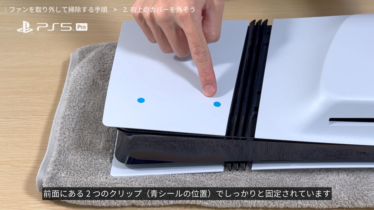 PS5 / PS5 Pro は、前面にある 2 つのクリップ(青シールの位置)でしっかりと固定されています。