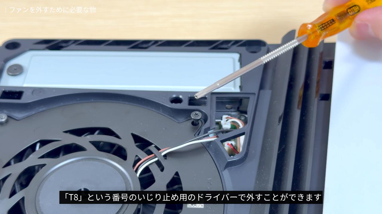トルクスドライバーにもいろいろありますが、ファンを固定しているネジは、「T8」という番号のいじり止め用のドライバーで外すことができます。