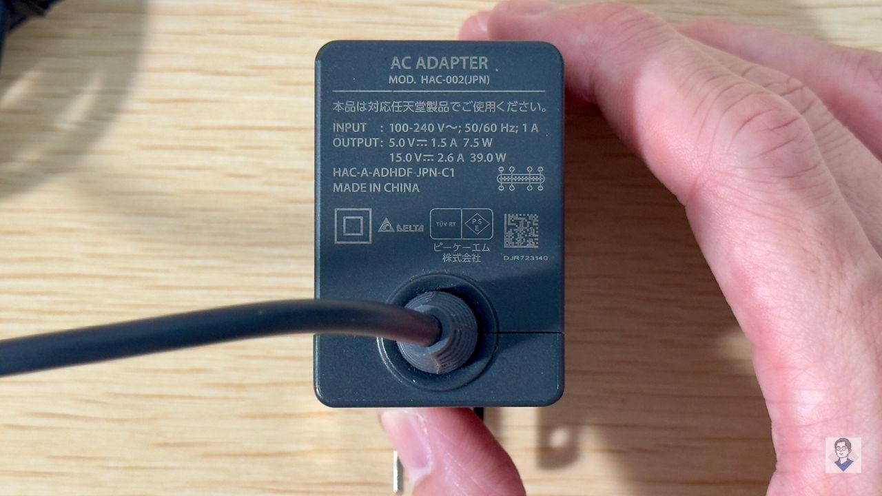 型番は「HAC-002」。有機ELモデルや Switch Lite のものと電圧などは同じで、外観もほぼ同じなので見分けることが困難です。