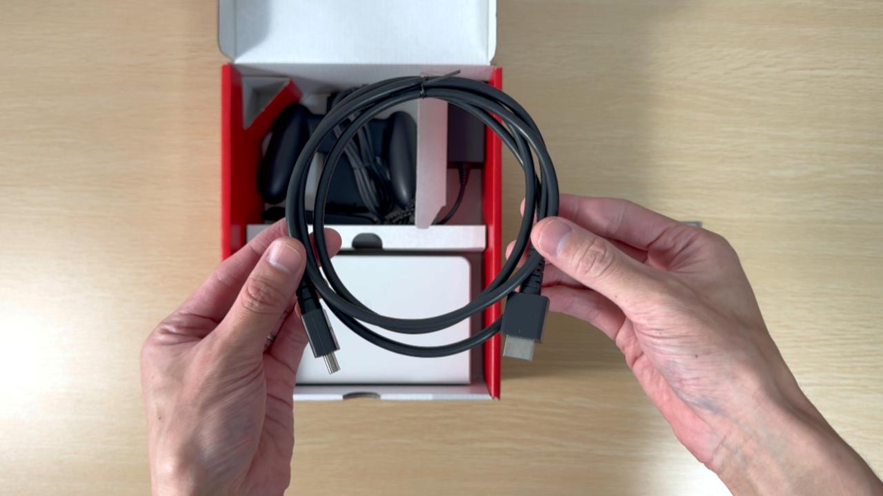 HDMI ケーブルを入れます。有機 EL モデルは、先端の四角い持ち手部分に「HEG-005」と記載があります。初代 Switch は「WUP-008」となっています。
