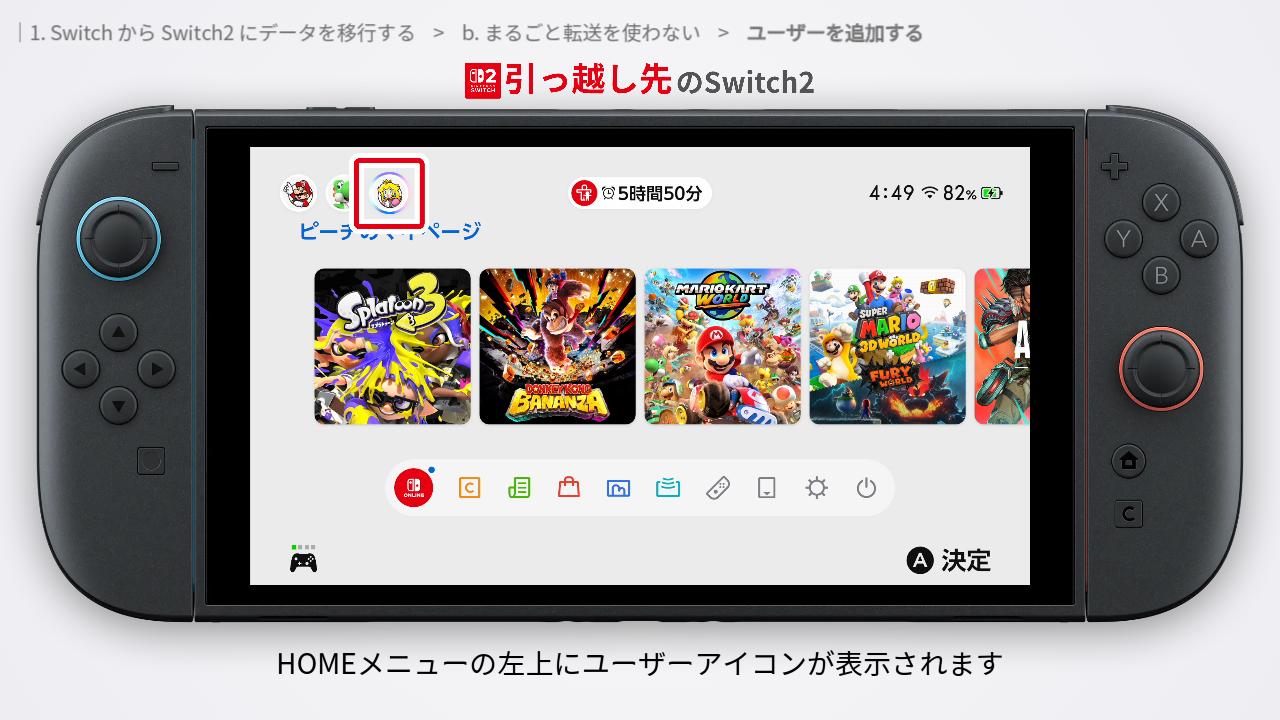 まずは、Switch から Switch2 にユーザーやセーブデータを移します。Switch2 にデータを移すことで、ゲームソフトを続きからあそぶことができます。