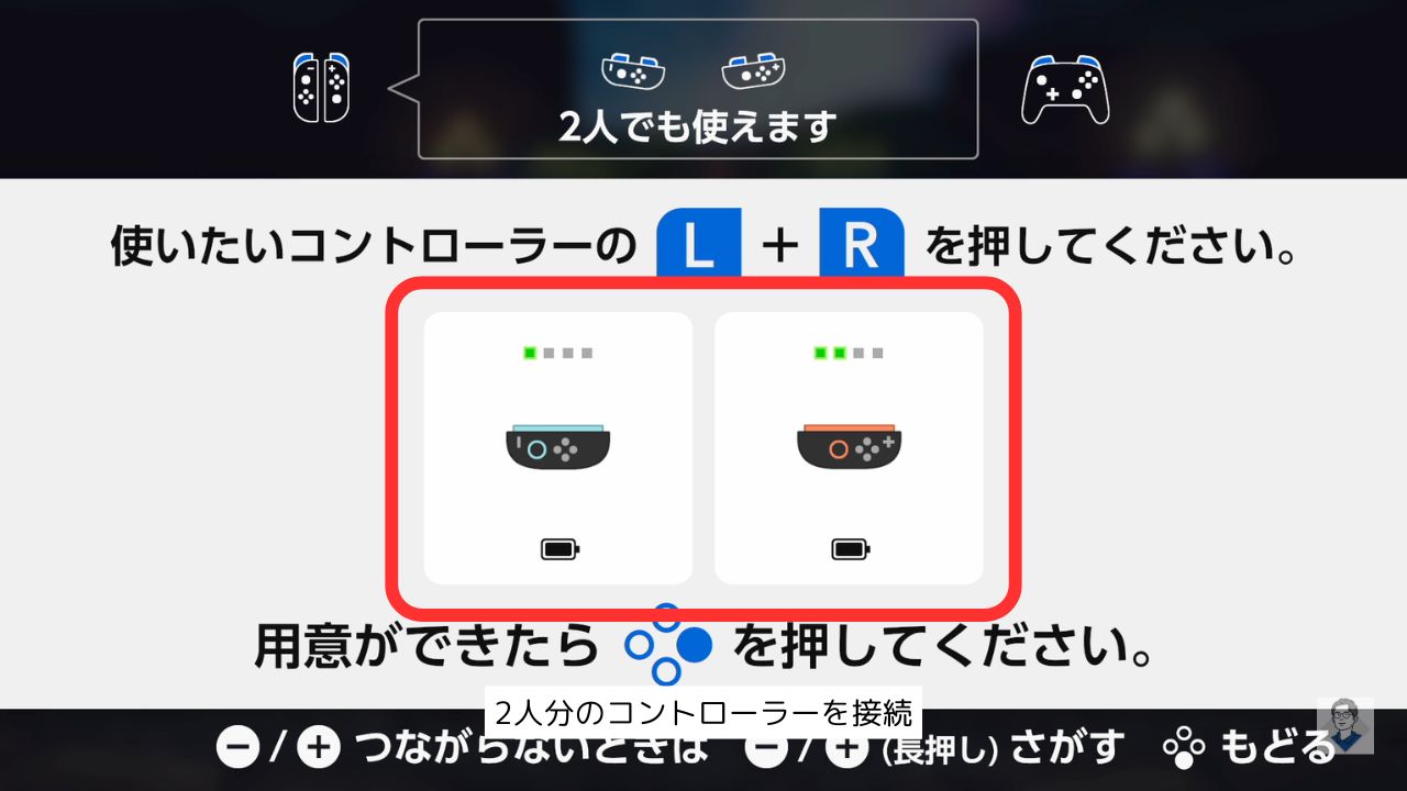 コントローラーの登録画面が表示されます。Joy-Con をおすそわけするなどして、2人分のコントローラーを接続します。