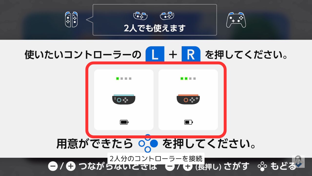コントローラーの登録画面が表示されます。Joy-Con をおすそわけするなどして、2人分のコントローラーを接続します。