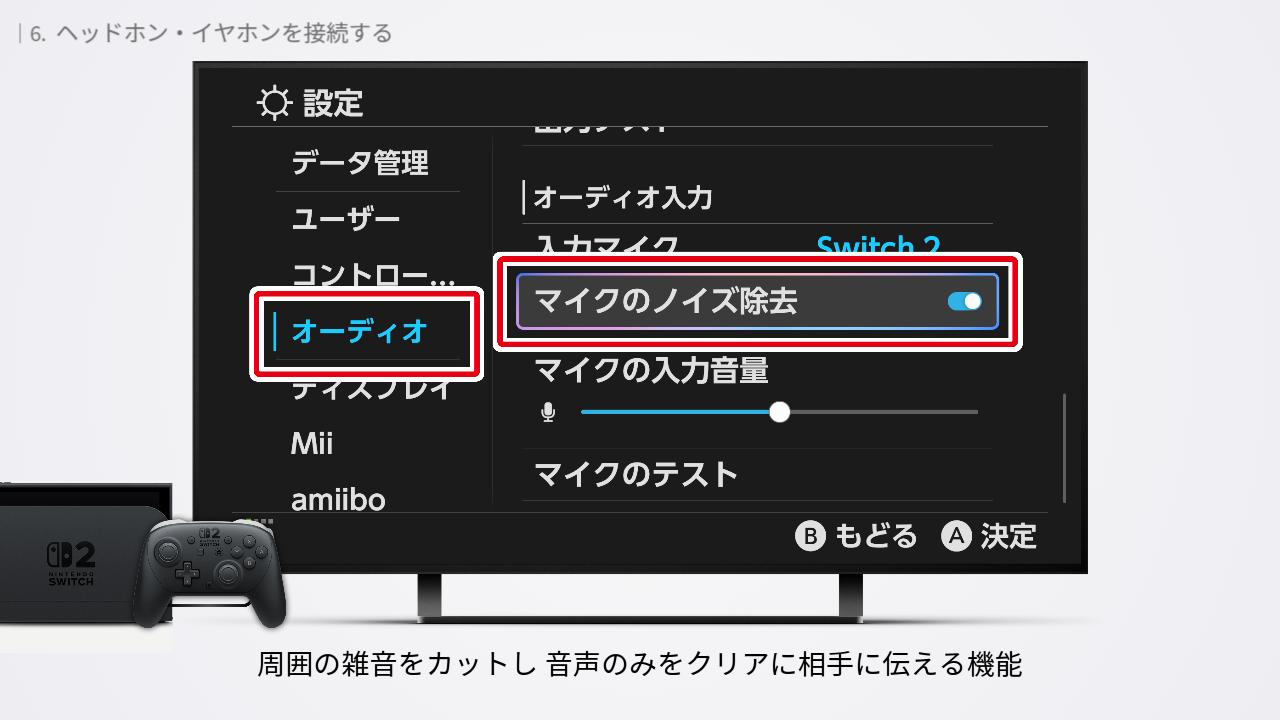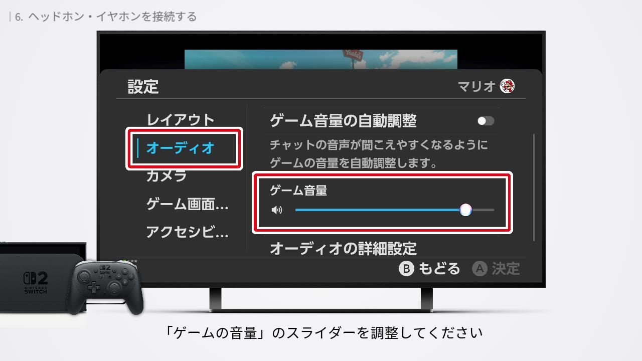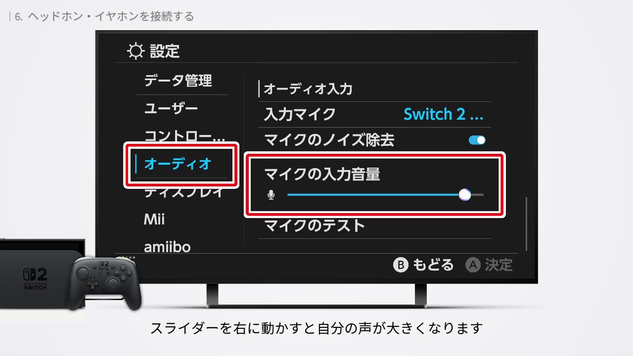 「オーディオの出力先」は、どこから音を聞こえるようにするかの設定。「自動」にすると、さいごに接続したヘッドホン・イヤホンから音が聞こえるようになります。プロコン2に接続したオーディオから音が聞こえないときは「Switch2 Pro Controller ヘッドホンマイク端子」を選択しましょう。