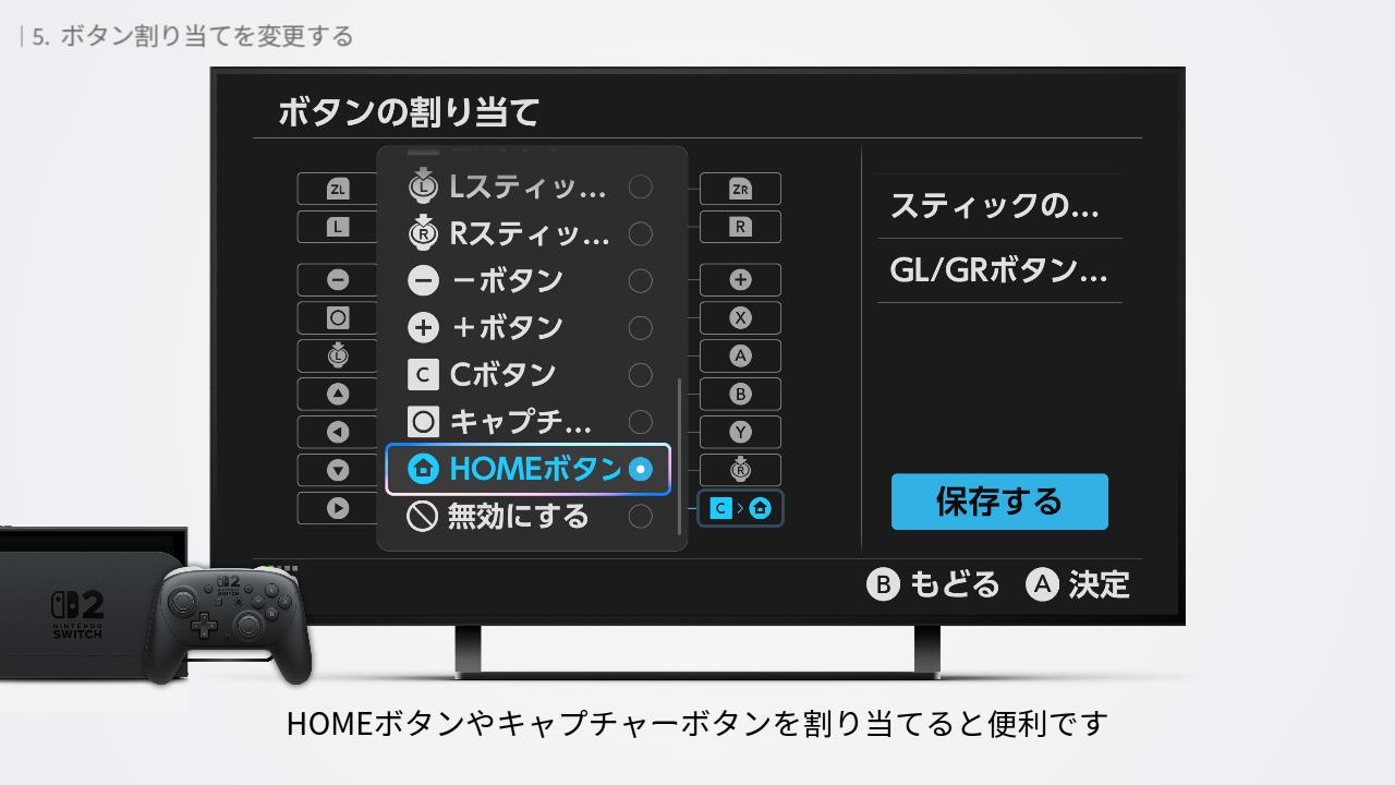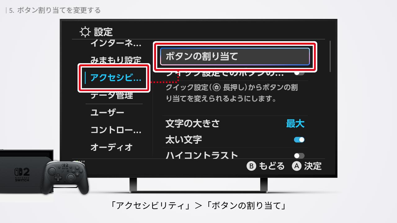 HOMEメニューで「設定」>「アクセシビリティ」>「ボタンの割り当て」。