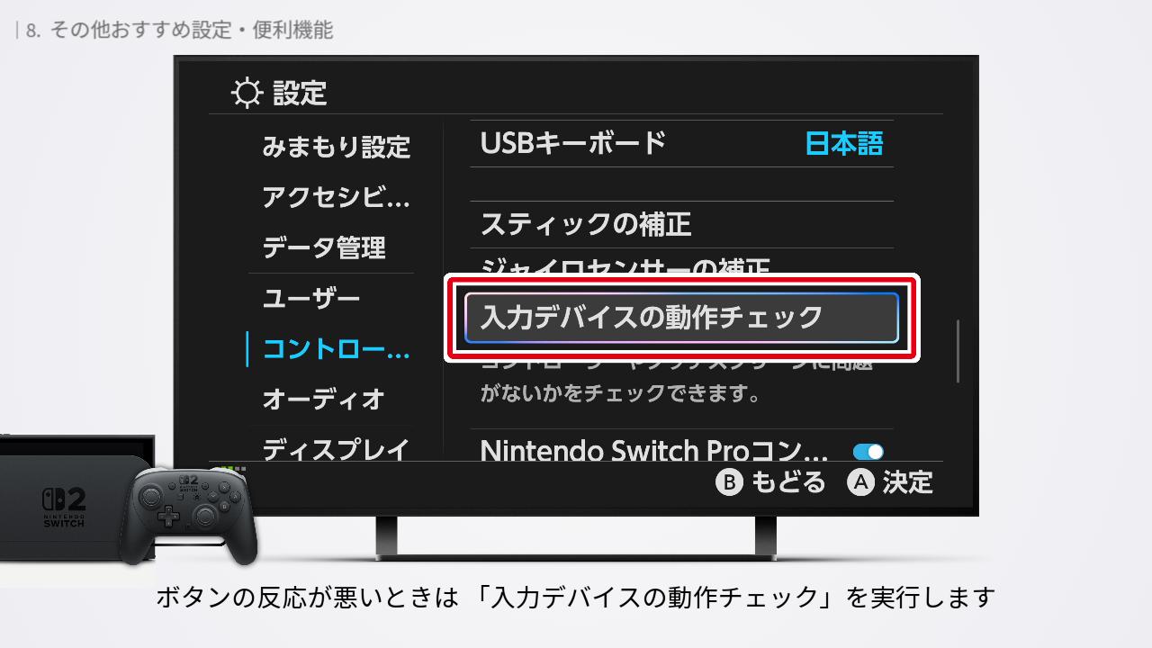 ボタンの反応が悪いときは「入力デバイスの動作チェック」を実行します。ボタンの動作チェックで正常に反応しているかが分かります。