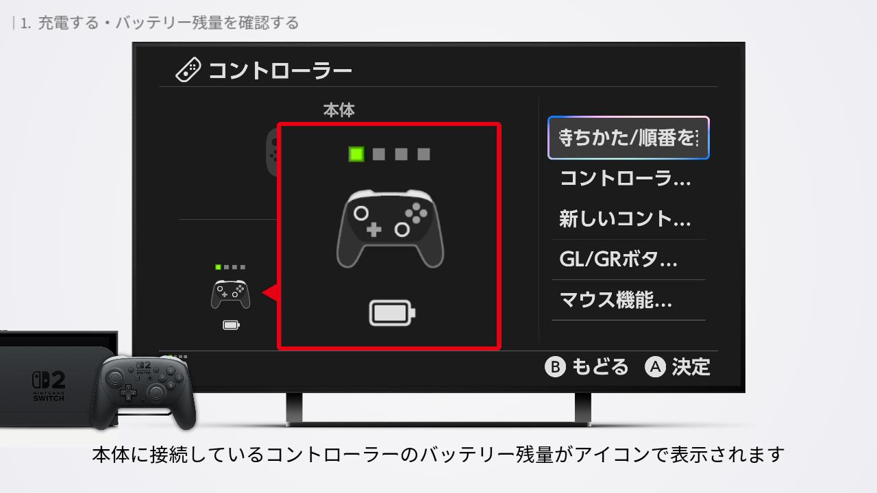 この画面で、本体に接続しているコントローラーのバッテリー残量がアイコンで表示されます。パーセンテージで確認することはできません。充電ができている場合は充電マークが表示されます。