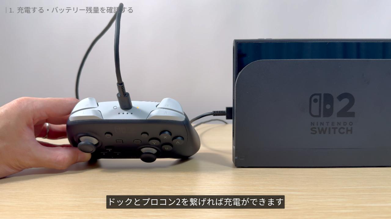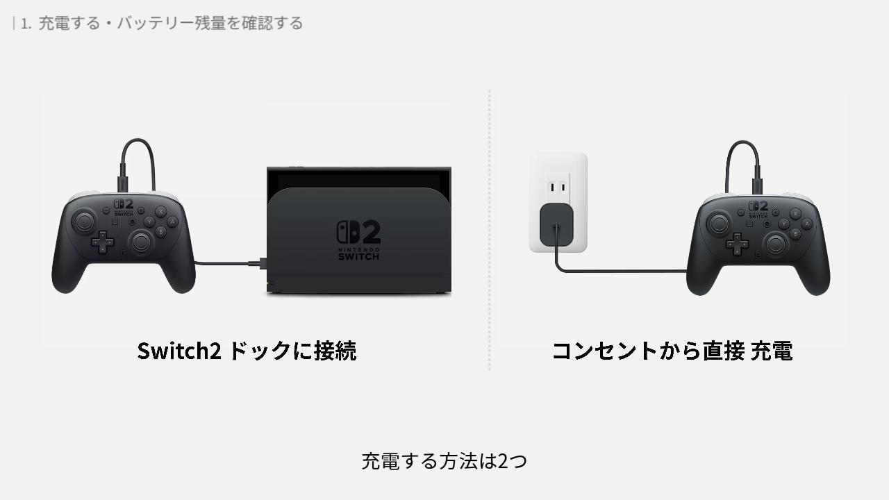 充電する方法は2つ。1つは Switch2 ドックに接続する方法。もう1つは、コンセントから直接 充電する方法です。