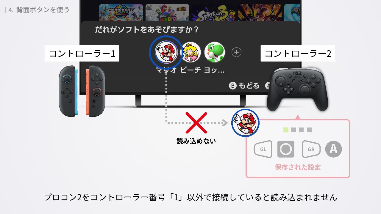 保存された設定は、設定したユーザーが、同じソフトを、コントローラー番号1でプレイする場合にのみ読み込まれます。他のユーザーが同じソフトを起動しても読み込まれません。設定したユーザーが同じソフトを起動した場合であっても、プロコン2をコントローラー番号1以外で接続していると読み込まれません。
