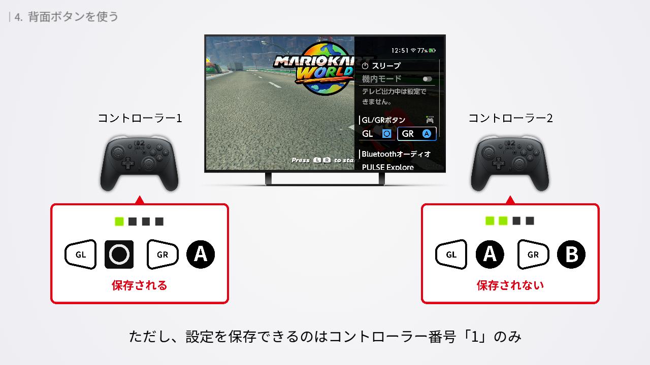 GL / GRボタンはコントローラー番号に関係なく設定できます。たとえば、プロコン2 を 2 台 接続した状態であれば、別々に背面ボタンを設定することができます。