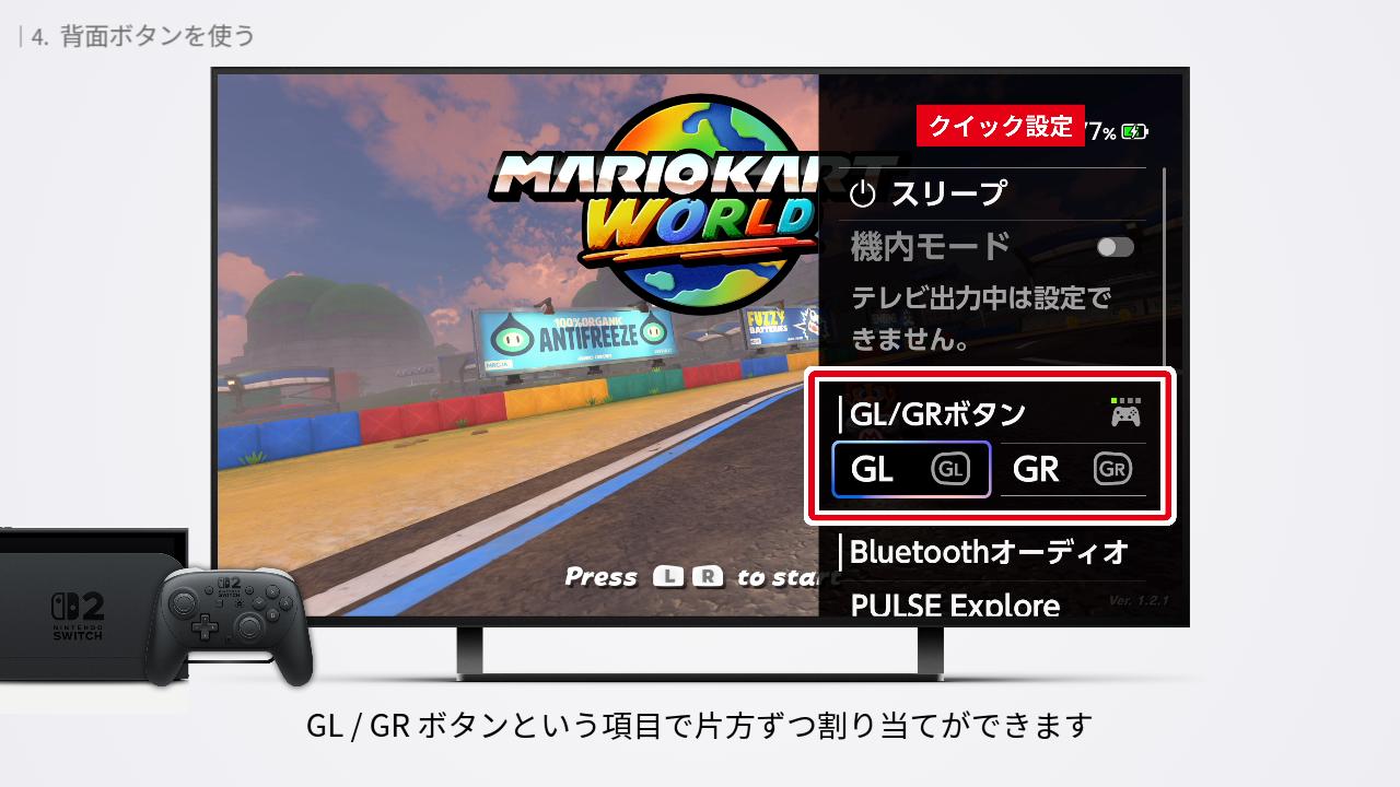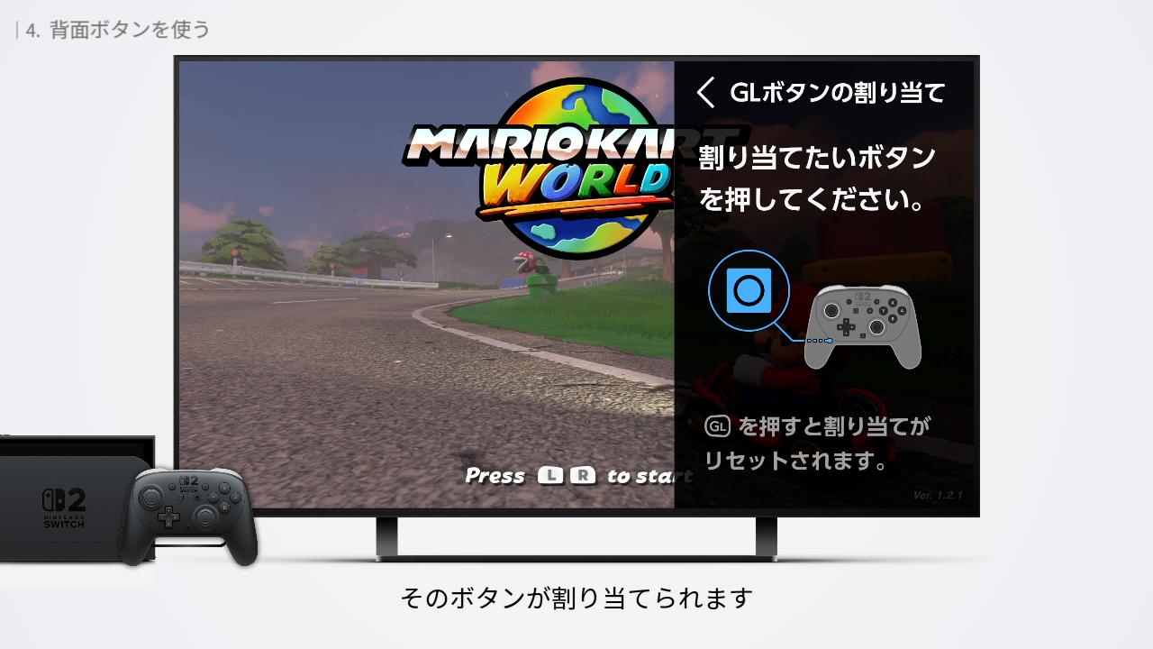 プロコン2 の背面には、GL / GR ボタンが搭載されています。それぞれ、好きなボタンを自由に割り当てることができます。
