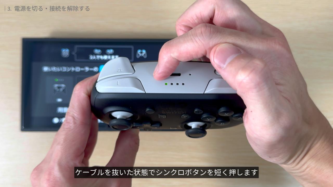 本体の電源は入れておき、プロコン2の接続だけ切りたいときは、ケーブルを抜いた状態でシンクロボタンを短く押します。プレイヤーランプが消えればプロコン2の電源はオフになっています。