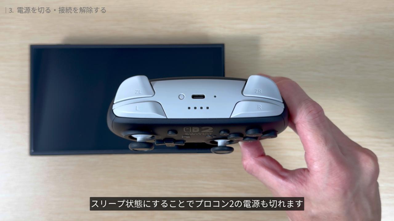 プロコン2の電源は、接続している本体と連動しています。本体の電源を切るか、スリープ状態にすることでプロコン2の電源も切れます。