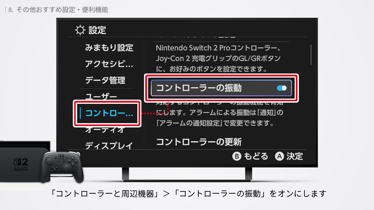 HOMEメニューの「設定」を開きます。「コントローラーと周辺機器」>「コントローラーの振動」をオンにします。
