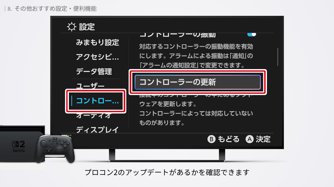 「コントローラーの振動」の下の「コントローラーの更新」では、プロコン2のアップデートがあるかを確認できます。配信されているとアップデートが実行できます。本体に比べてアップデートは少ないですが、定期的に確認することをおすすめします。