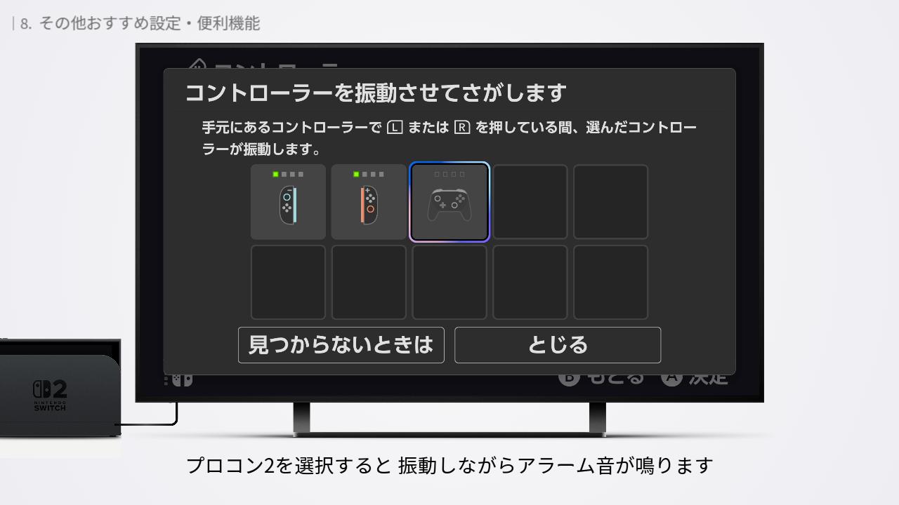 見当たらなくなったプロコン2は、振動と音を鳴らして探すことができます。