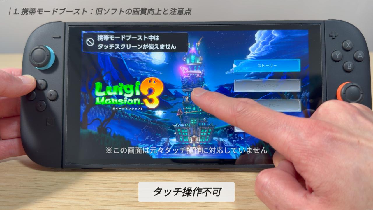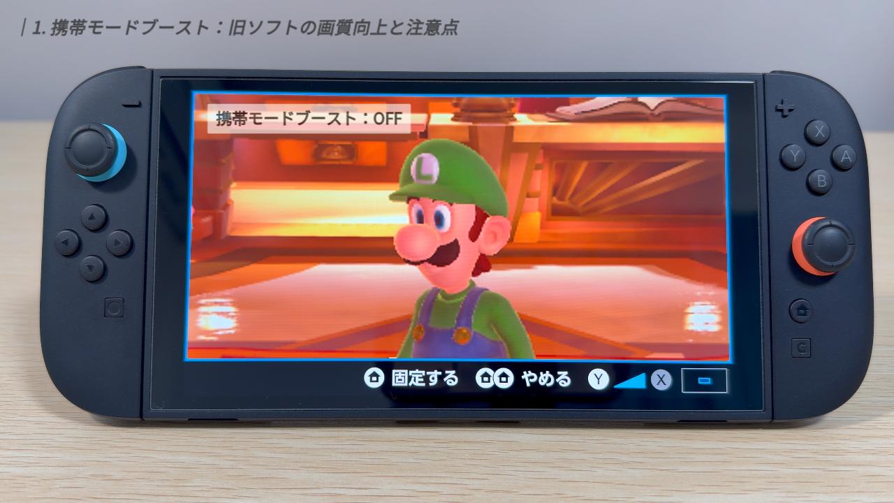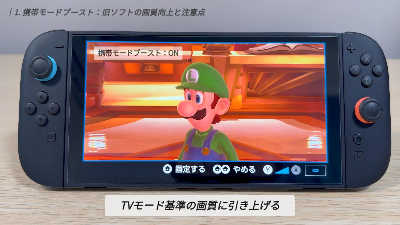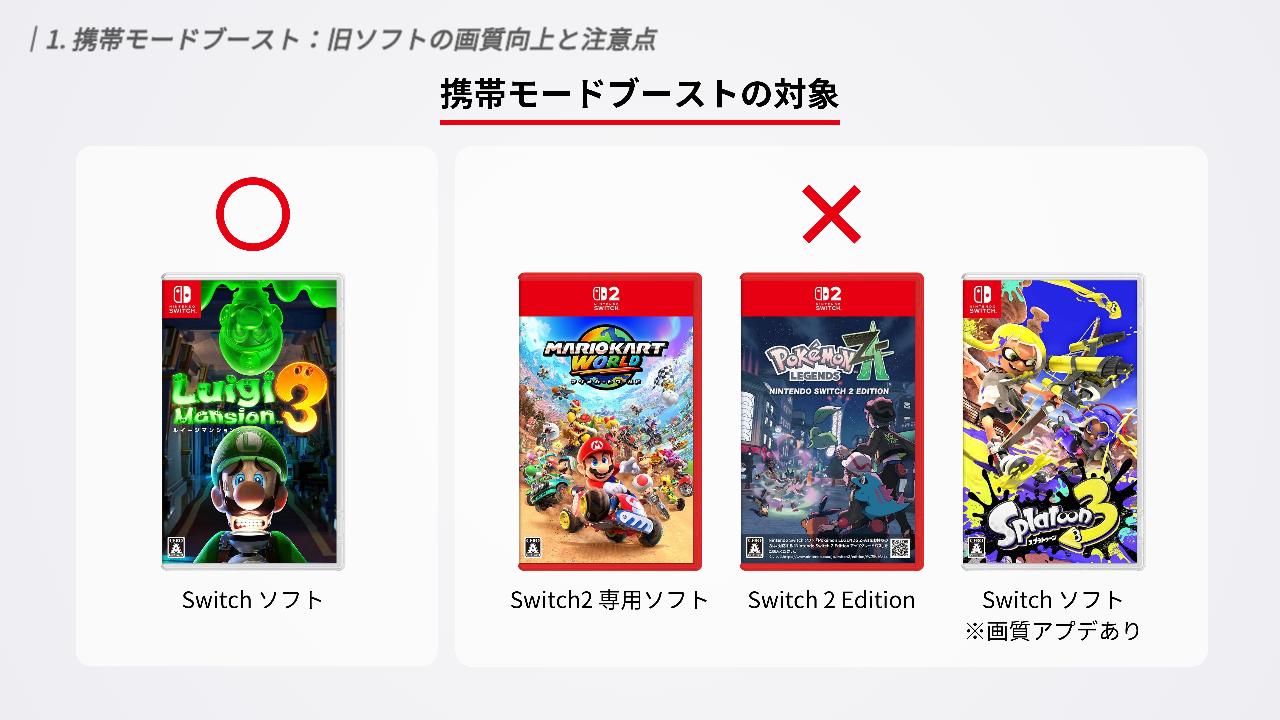 まず、この機能はあくまで旧Switchソフト向けの設定です。最初から携帯モードでも高画質に描画されるSwitch 2専用ソフトや「Switch 2 Edition」は、このブーストの対象外です。