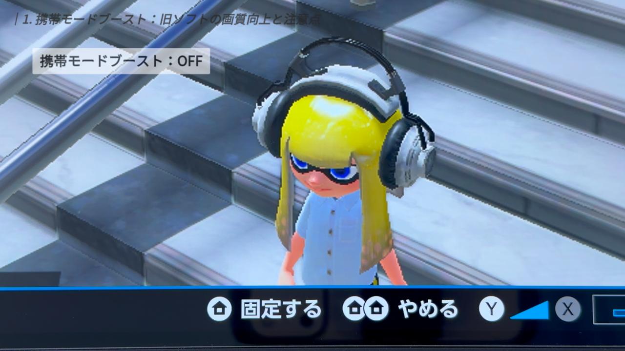 こちらはすでにソフト側で解像度が最適化されているため、ブーストなしでも精細な映像で遊べます。実際に「スプラトゥーン3」で比較しましたが、こちらも変化はありませんでした。