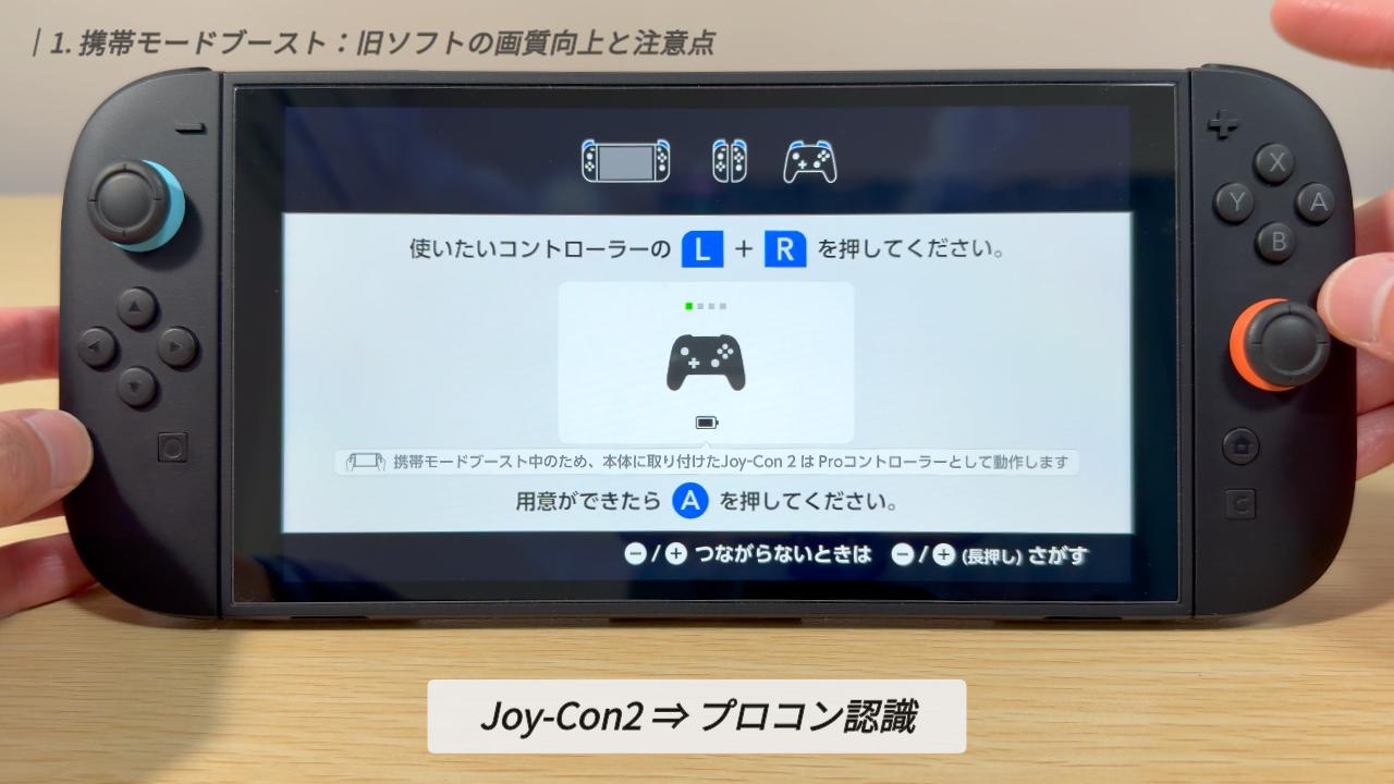 また、本体に取り付けたJoy-Con2は「プロコン」として認識されるようになります。別のコントローラーを併用したい場合は、本体のJoy-Con2を取り外す必要がある点に注意してください。