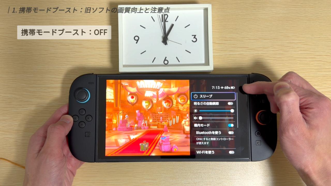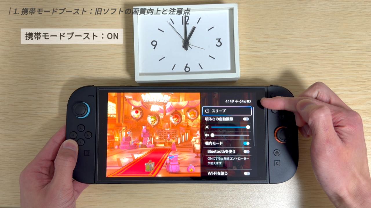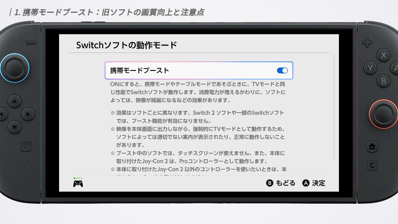 まずはじめに紹介するのは、注目の新機能「携帯モードブースト」です。これは、旧SwitchのソフトをSwitch 2で遊ぶ際、携帯モードやテーブルモードの状態でも、TVモード基準の画質で動作させる設定です。