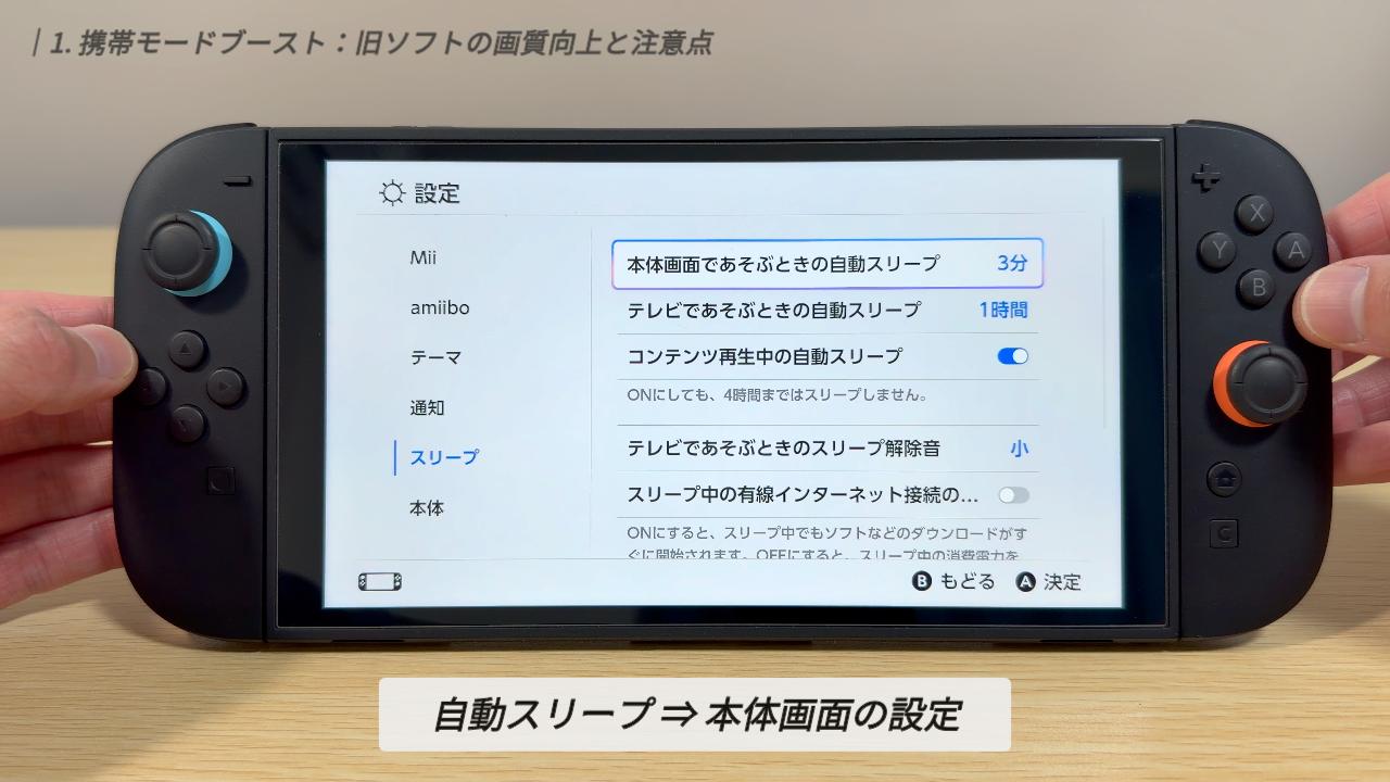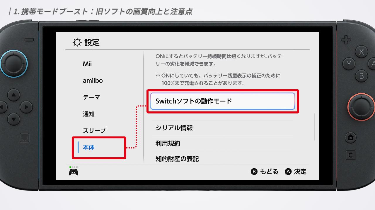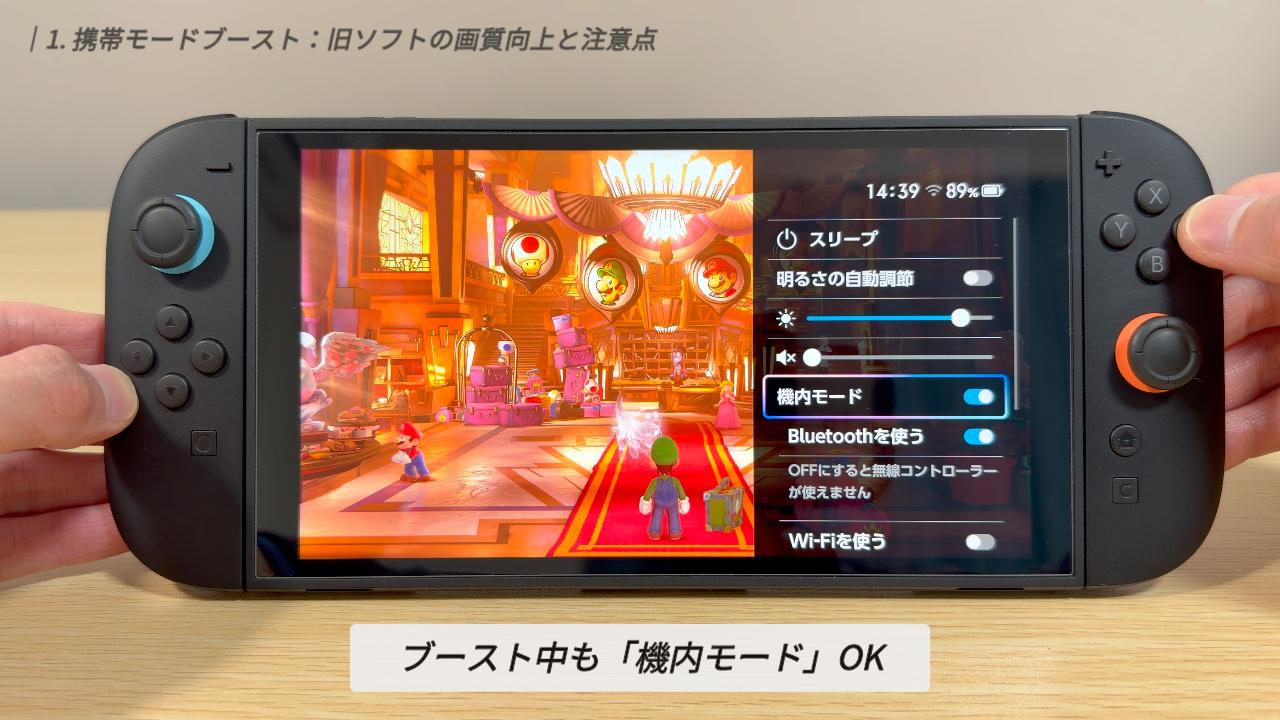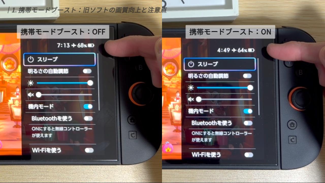 まずはじめに紹介するのは、注目の新機能「携帯モードブースト」です。これは、旧SwitchのソフトをSwitch 2で遊ぶ際、携帯モードやテーブルモードの状態でも、TVモード基準の画質で動作させる設定です。