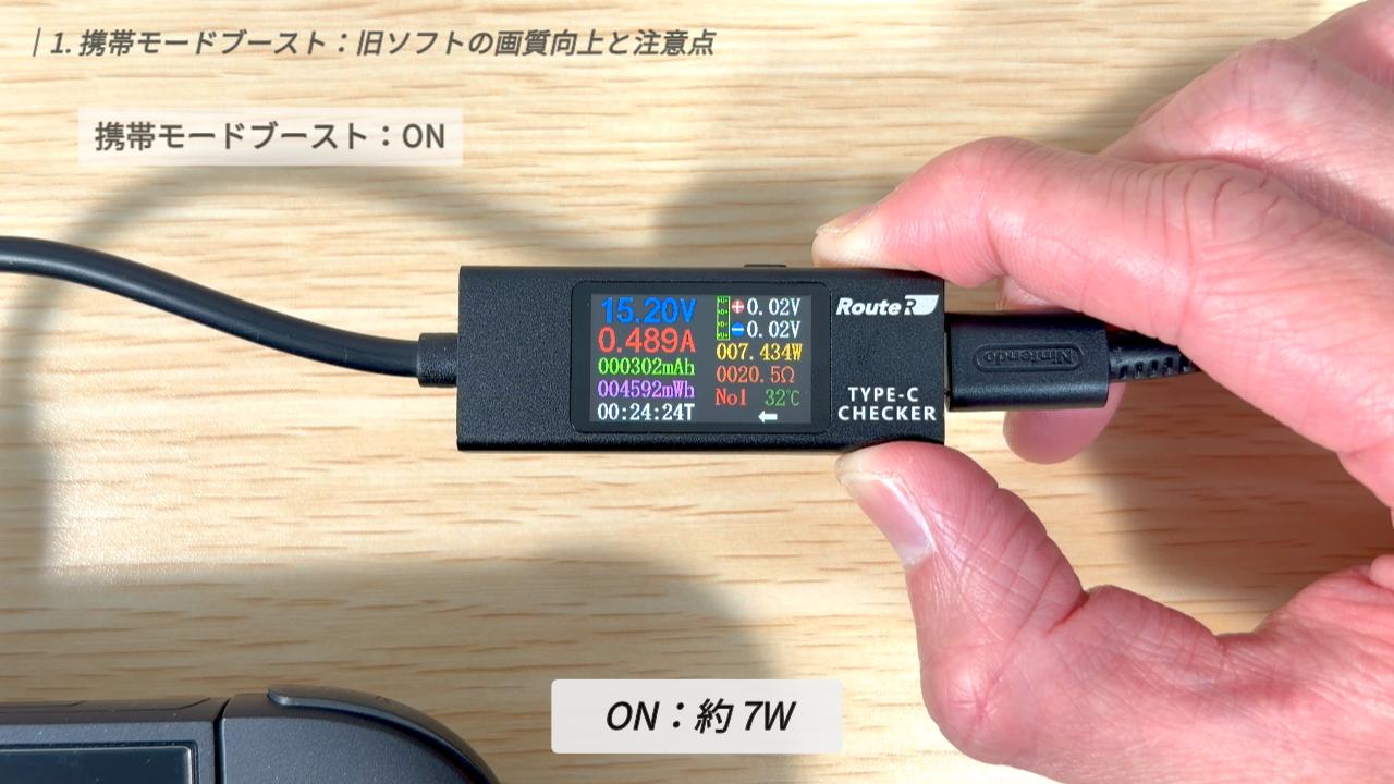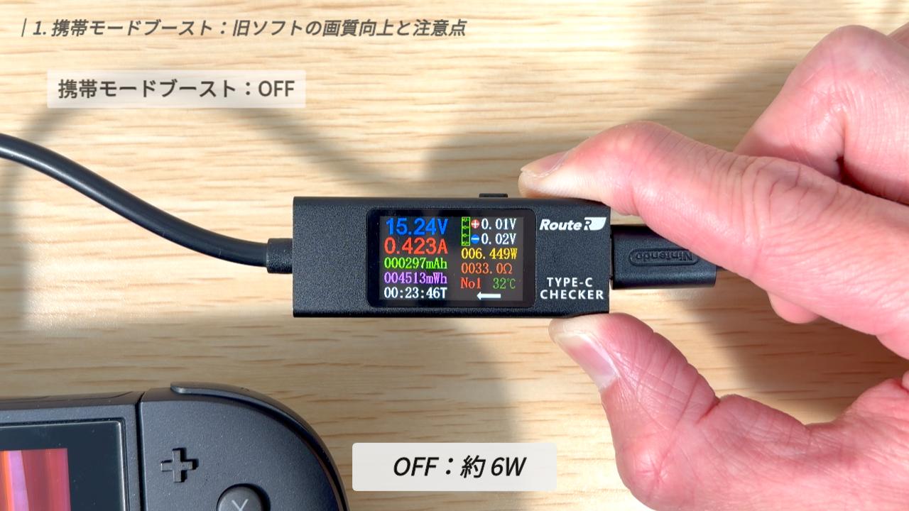 実際に電流チェッカーを使い、同一シーンでの消費電力を測定してみました(より正確な数値を出すために、本体を100%まで満充電にして、純粋なシステム消費電力のみを比較しています)