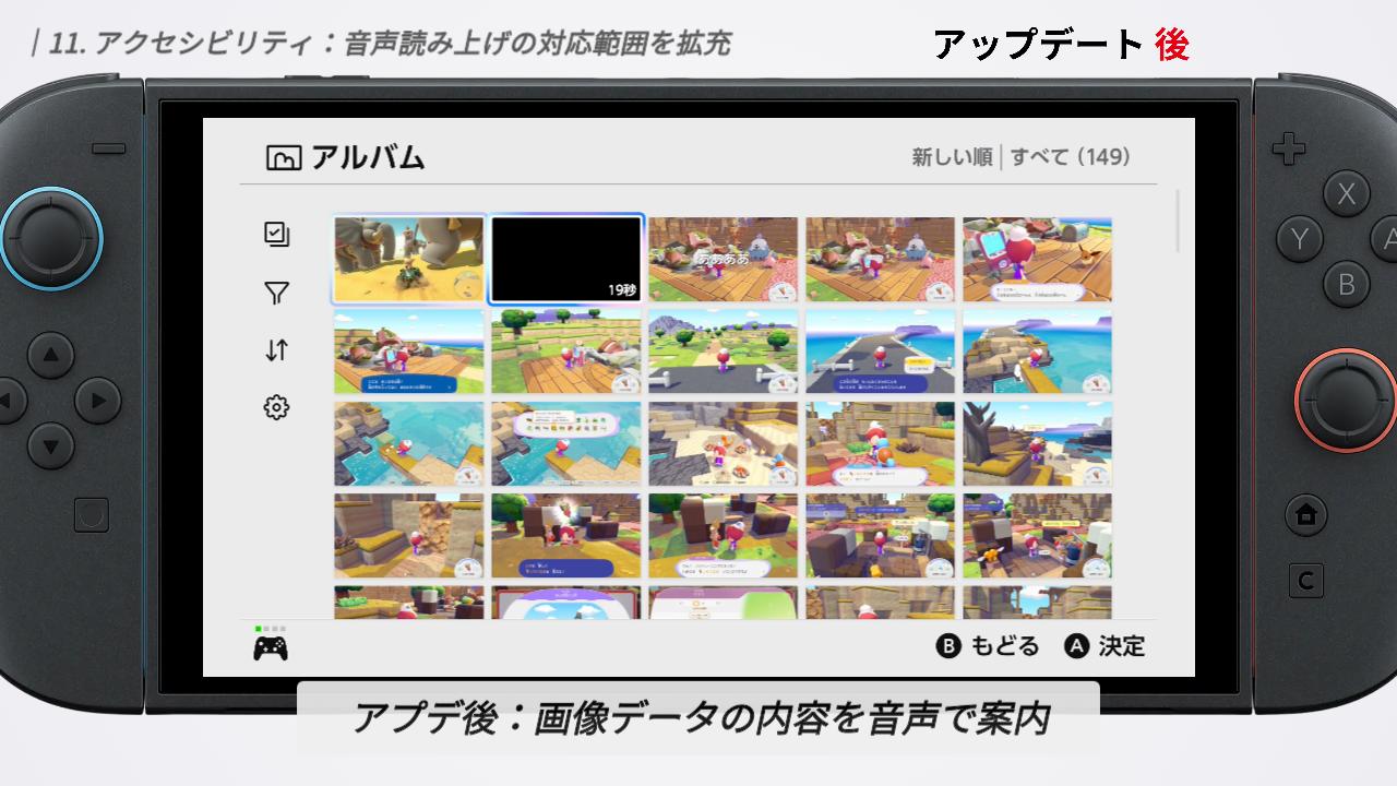今回のアップデートで、選択しているデータが写真なのか動画なのかといった判別や、左メニューの操作内容まで音声で確認できるようになっています。