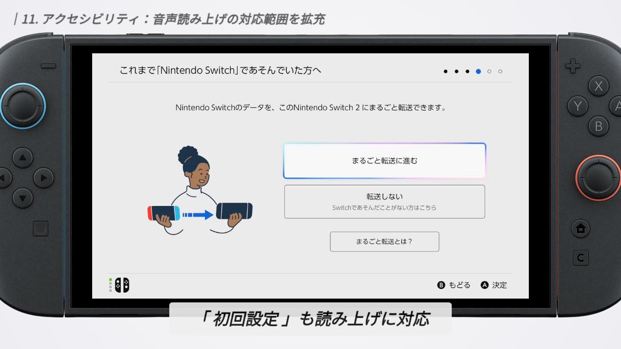 まるごと転送を行うか選ぶ画面でYボタンを長押ししてください。 その場で音声読み上げが有効になり、最初のセットアップから音声ガイドと一緒に進められるようになりますよ。