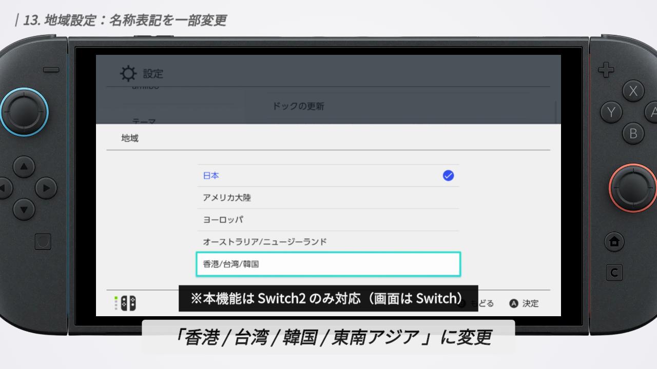 最後に、本体設定の「地域」に関する名称変更です。