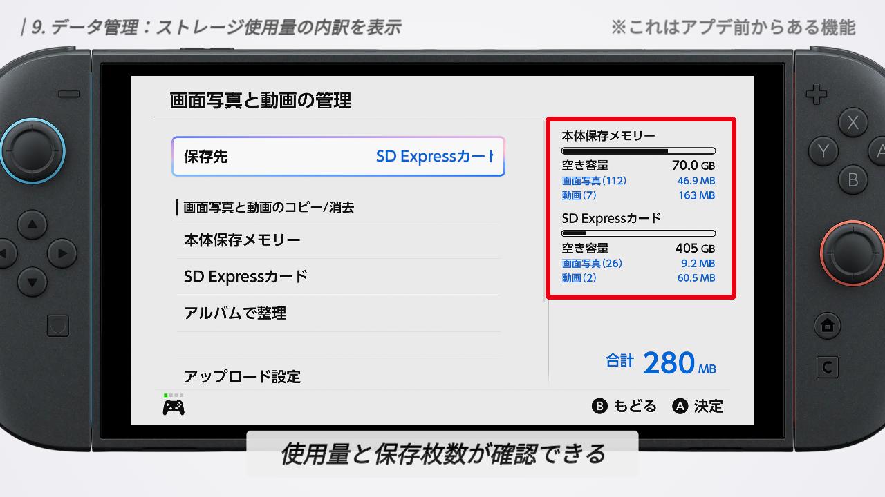 画像データの使用量については「画面写真と動画の管理」から確認できます。ここでは、本体とSD Expressそれぞれの「使用容量」だけでなく「保存枚数」まで表示されるようになっています。