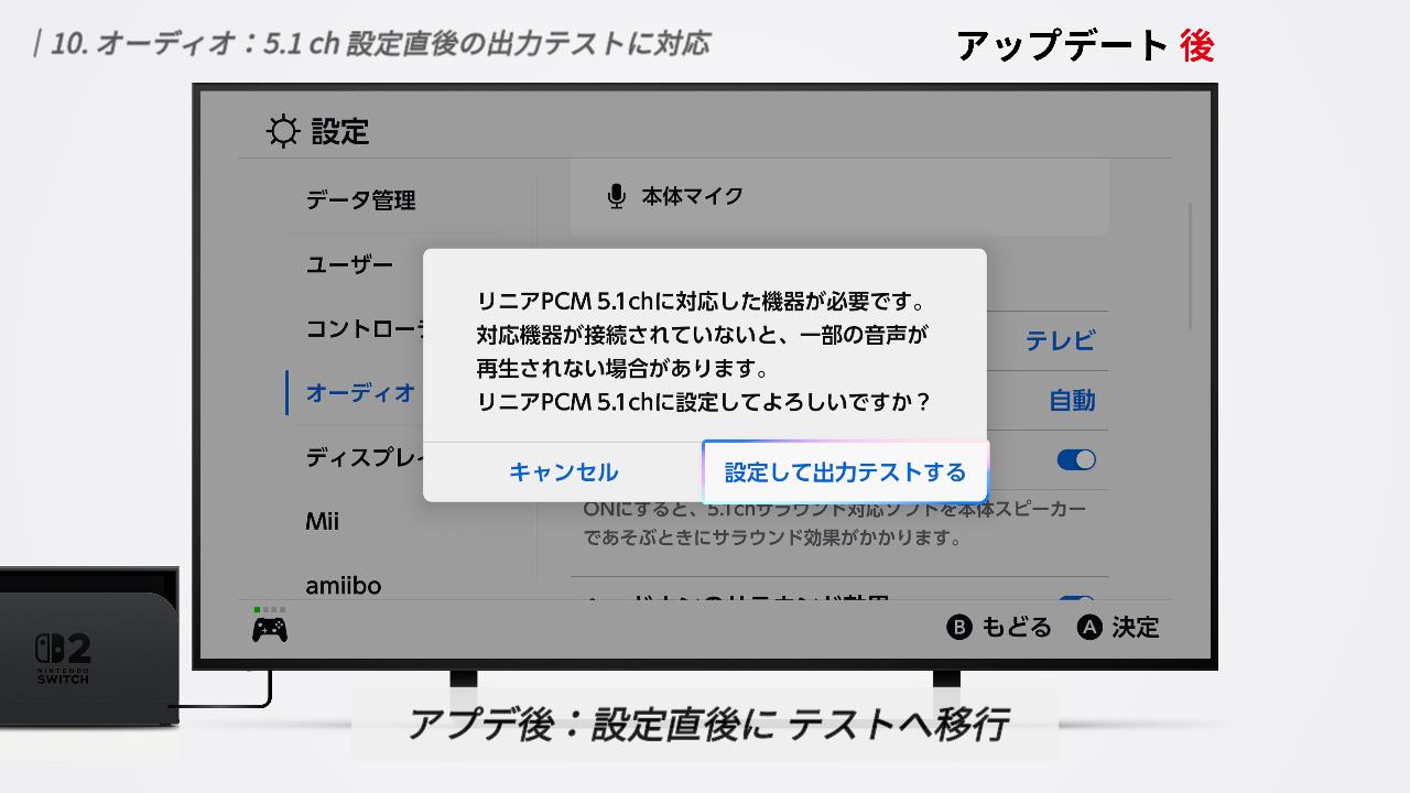 これまでは、設定を変えたあとに出力テストまで移動しないと、自分の音響環境が5.1chに対応しているかどうかわかりませんでした。 今回のアップデートからは、5.1chを選択した直後に「設定して出力テストする」という項目が表示されるようになっています。