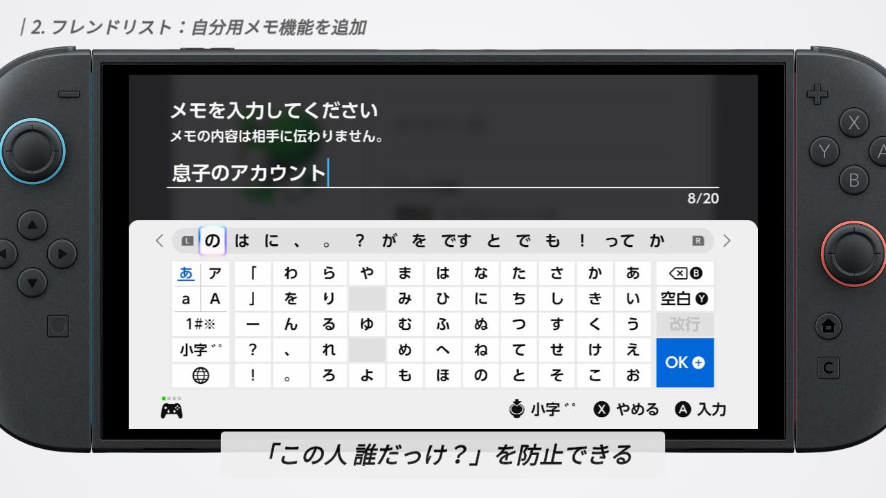 メモの長さは最大で20文字まで。自分だけが見れる設定なので、相手や他のユーザーに表示される心配はありません。いつ、どのソフトで一緒に遊んだ人かをメモしておくのはもちろん、前回のチャットで話した内容を記録しておく、なんて使い方も便利ですよね。