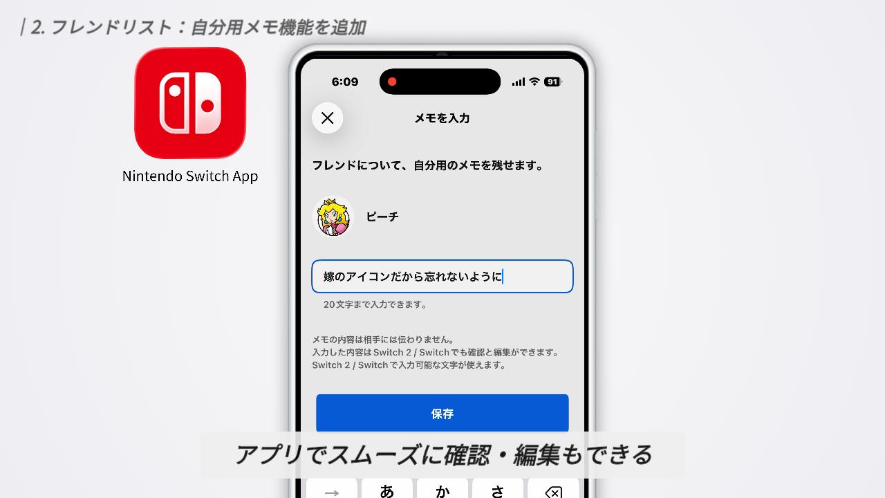 「Nintendo Switch App」を使えば、このメモの確認や編集も可能です。本体で打つよりスマホの方が圧倒的にスムーズなので、こまめに編集したい時はアプリを使うのがおすすめですよ。