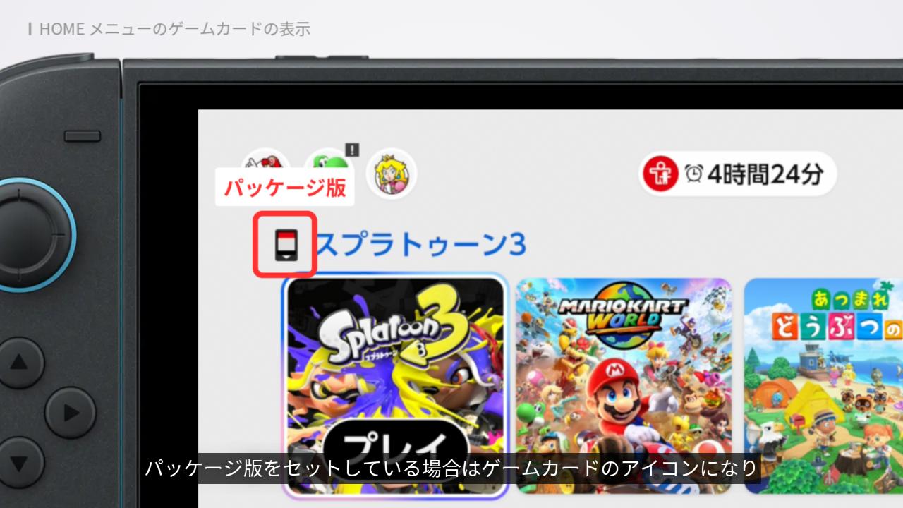 今回のアップデートで、パッケージ版をセットしている場合はゲームカードのアイコンになり、ダウンロード版をセットしている場合はバーチャルゲームカードのアイコンが表示されるようになりました。