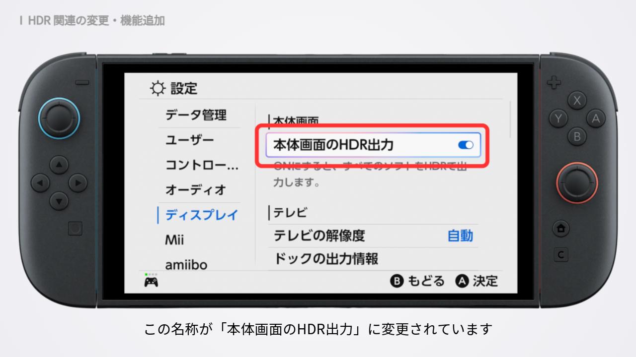 アップデート後は、この名称が「本体画面のHDR出力」に変更されています。