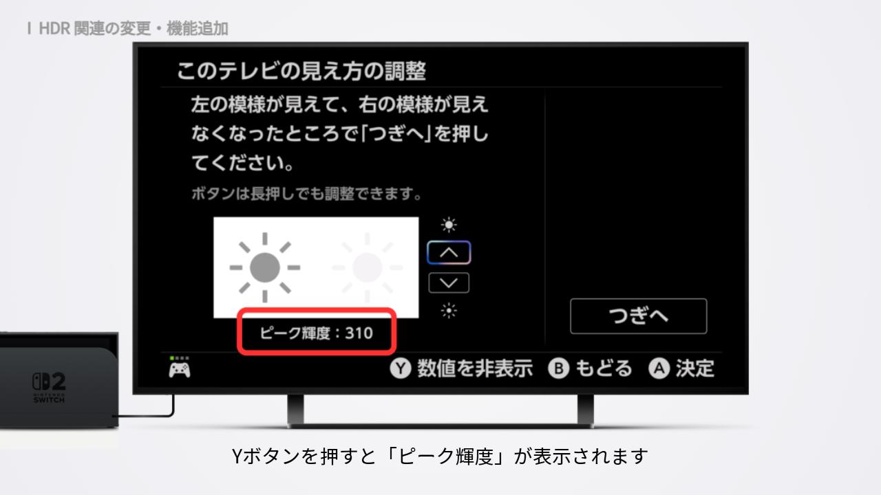 ディスプレイ設定の一番下にある、「HDR調整」を開いてください。テレビの見え方の調整で、Yボタンを押すと「ピーク輝度」が表示されます。以前は数値で確認できなかったので、感覚で調整していた人も多かったと思います。数値で把握できるようになったことで、繰り返しの調整がしやすくなりました。