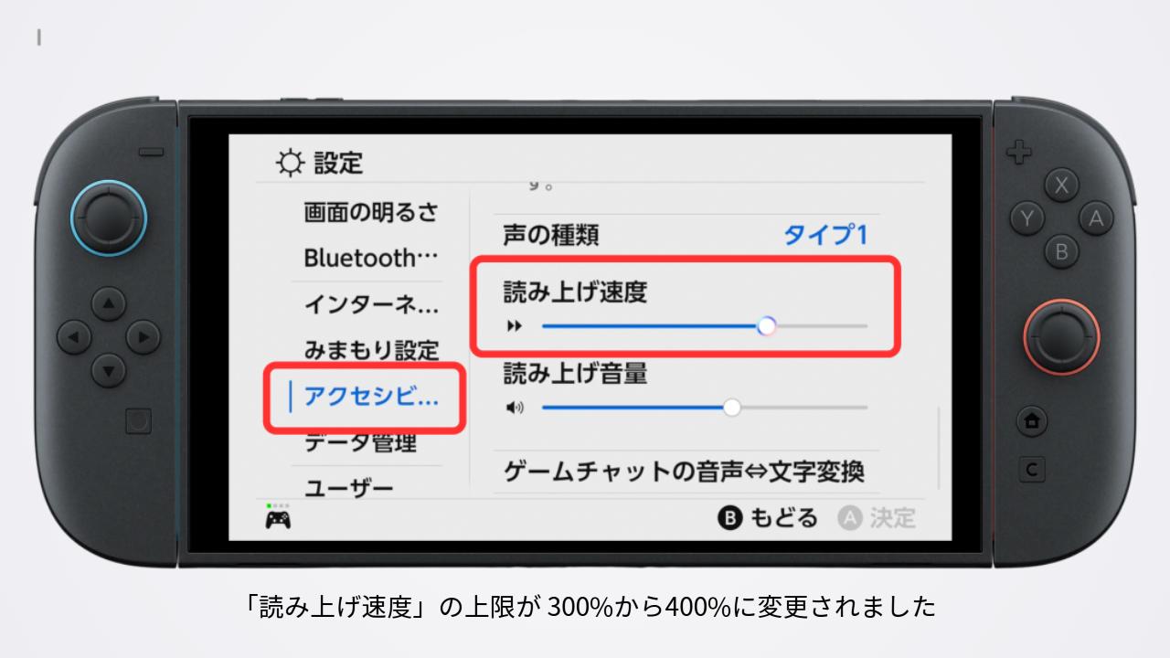 「アクセシビリティ」→「音声読み上げ」で、「読み上げ速度」の上限が、300%から400%に変更されました。