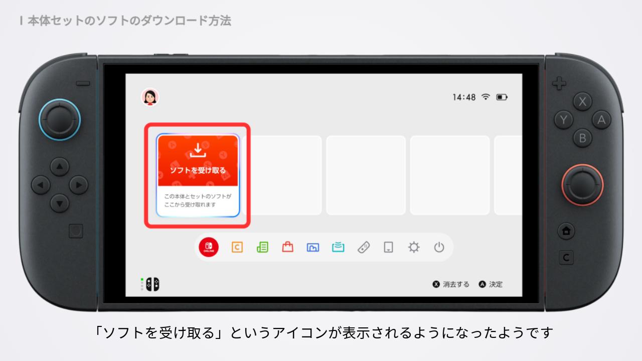 アップデート後は、本体を起動すると「ソフトを受け取る」というアイコンが表示されるようになったようです。※本体がインターネットに接続されている場合