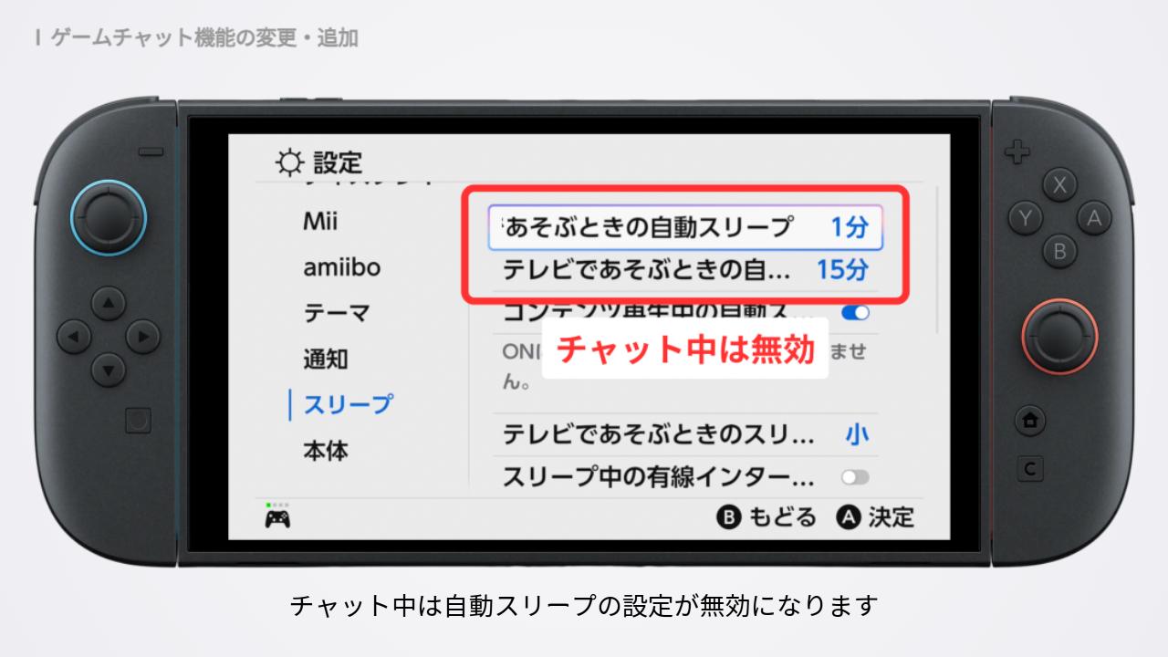 1つ目は、チャット中に自動でスリープしなくなったこと。Switch2は、一定時間操作しなかったときに、自動でスリープ状態になるまでの時間を設定できます。