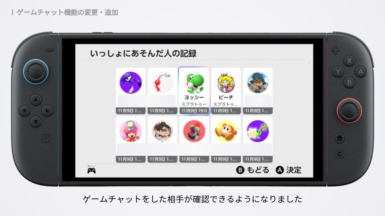 アップデート後は、「いっしょにあそんだ人の記録」からもゲームチャットをした相手が確認できるようになりました。
