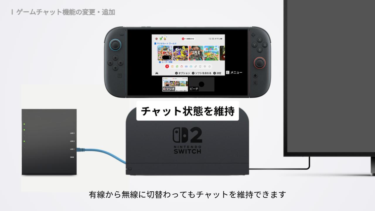 Switch2は、ドックを有線で接続した状態でチャットを開始し、携帯モードに切り替えると、無線接続に自動で切替わります。