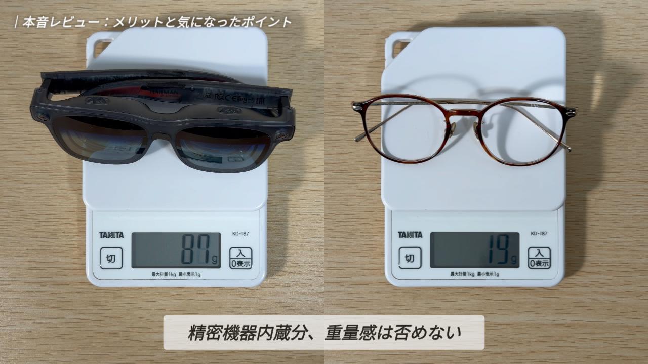 グラスの重さを実際に計測したところ、87gありました。私が普段使用している眼鏡が19gですので、ディスプレイやスピーカーといった精密機器を内蔵している分、どうしても重量感は否めません。眼鏡に慣れている私でさえ、装着直後から特有の重みを感じるのが正直なところです。