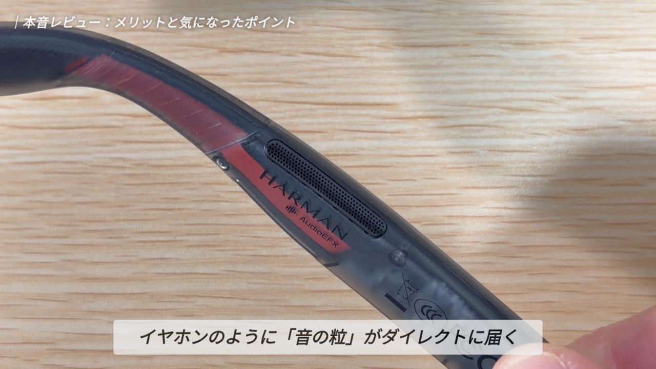 接続先のデバイスの音は、左右のテンプルに搭載されている「指向性スピーカー」から聞こえる仕組みです。このスピーカーは、音声を耳元に届けつつ、周囲への音漏れを最小限に抑える設計がされています。