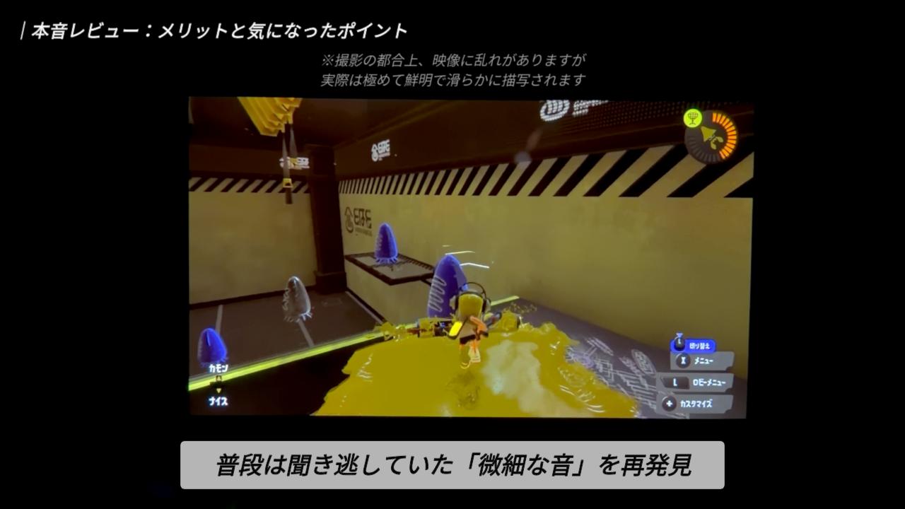 当初、これほど小型のスピーカーであれば、あくまで補助的なものだろうと想像していましたが、実際に聴いてみると、想像以上にクリアで解像度の高い音質に仕上がっています。たとえば「スプラトゥーン3」をプレイ中、ローラーが回転する際の細かな機械音など、普段の環境では聞き取れなかった繊細な音まで鮮明に捉えることができました。