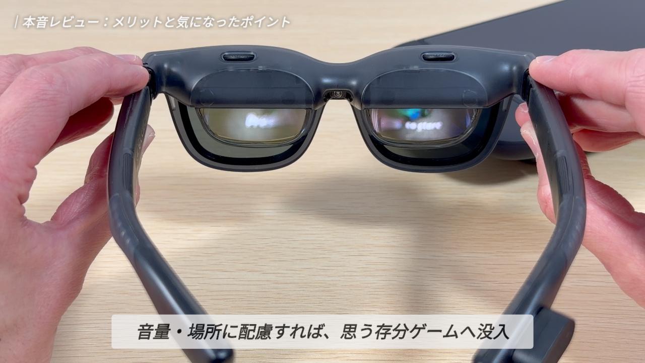 画面のサイズ感も圧倒的です。イメージとしては、携帯モードのSwitch2を顔の至近距離まで寄せたような迫力がありますが、重い本体を支え続ける必要はありません。寝転ぶなど、自分にとって最も楽な姿勢でこの大画面を独り占めできるのは、スマートグラスならではのメリットですね。