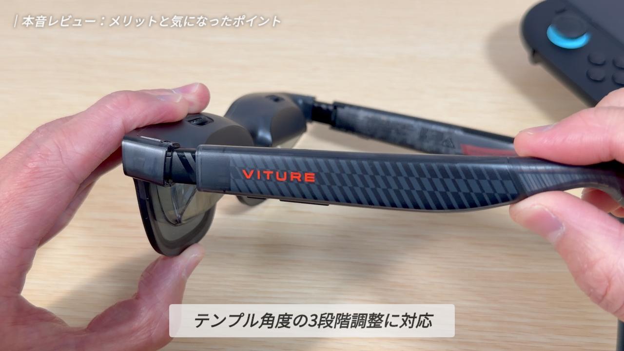 テンプルの角度を3段階で調整可能なのも特徴的です。自分の顔の形に合わせて、見やすい角度や安定する位置に微調整できるのは親切な設計だと感じました。
