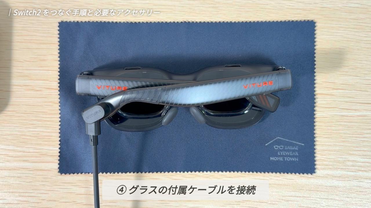 このケーブルで Switch2 とドックを繋ぎ、ドックからグラスへと映像を出力することで、レンズの中にゲーム画面が映し出される仕組みです。