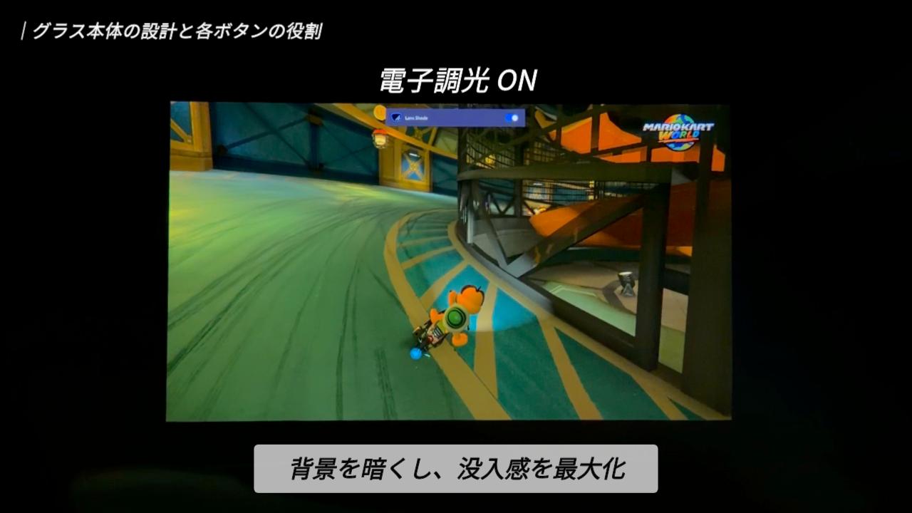 画面の明るさについても、最大設定では眩しさを感じるほどのパワーがあります。明るい室内であっても、電子調光フィルムをONにすれば背景が瞬時に暗くなり、一気にゲームの世界へと没入できます。