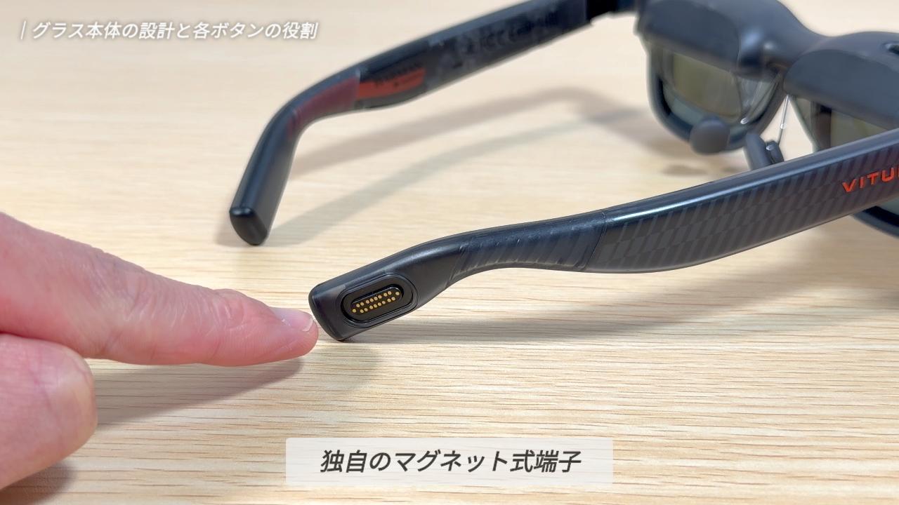 テンプルの先端にあるのが、独自の「マグネット式接続端子」です。付属の専用ケーブルを近づけるだけでカチッと吸着し、映像入力と給電が同時に開始されます。